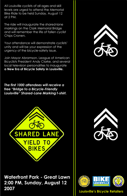2:00 pm - 3.33/30 mi. #2. Bridge to a Bike-Friendly Louisville memorial ride in honors of Chips Cronen. Waterfront Park, Great Lawn. RC: Eric Sellers, 216-8248.